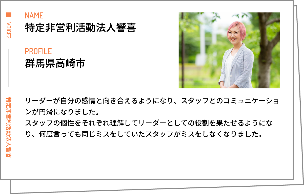 介護福祉士としてキャリアをスタート。 20代前半で管理職を経験、人材育成に携わってきましたが、年上部下のマネジメントに悩み挫折。失敗を繰り返したくない思いから、トップダウン式のマネジメントを部下に行うようになっていたことに気付く。またパートナーとの関係が上手くいっていなかったこともあり、それらの悩みを解決するために「コーチング」を学ぶ。 現在は福祉業界のリーダーに向けて、コーチングの普及活動の他、パーソナルコーチングを提供。